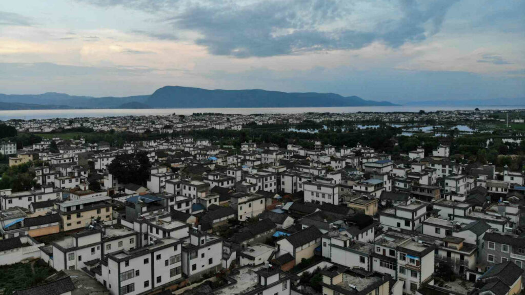 洱海の東側に位置する観光スポットで、レストランやお土産店、カフェなどが崖の側面に作られた奇抜な形の建物の中にひしめいています。