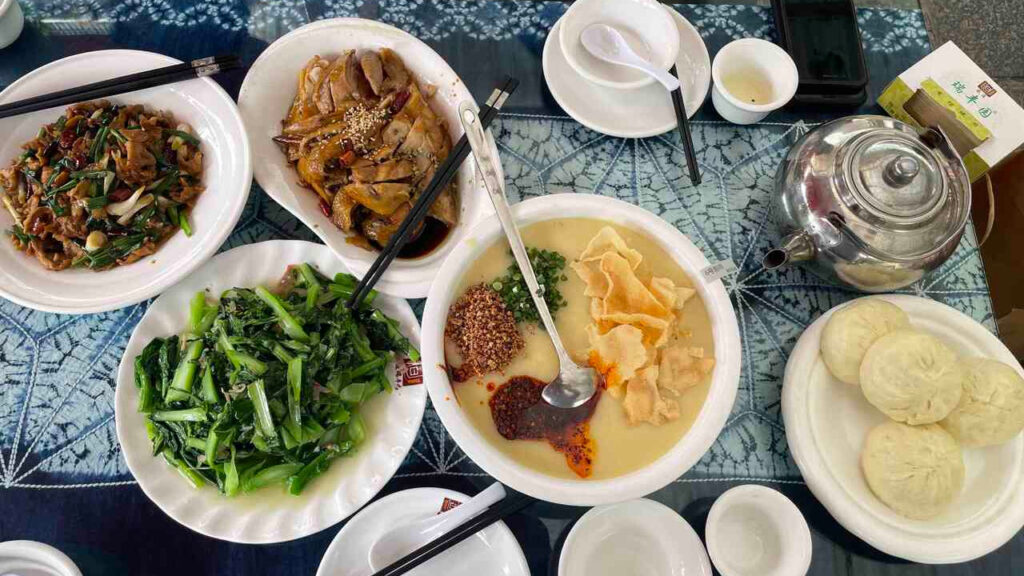 真ん中のスープのような料理が白族伝統料理。ずんだのように豆を擦りつぶし、その上に唐辛子などをかけたものです。