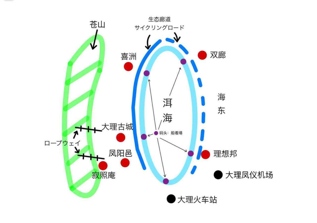 一周が130キロある洱海を囲む形で各地にスポットが点在しています。洱海の左側を「海西」、右側を「海東」と呼ぶことが多いです。