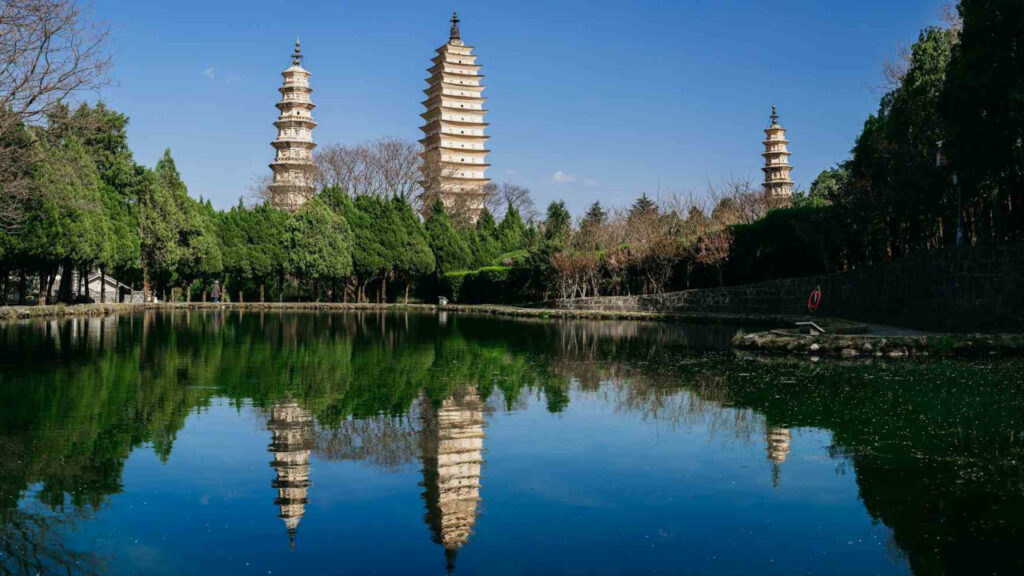 大理古城の郊外約2キロのところにある、大理のランドマーク的な存在。外から眺めるだけでも迫力があります。三塔の前の池に映る逆さ三塔が有名です。