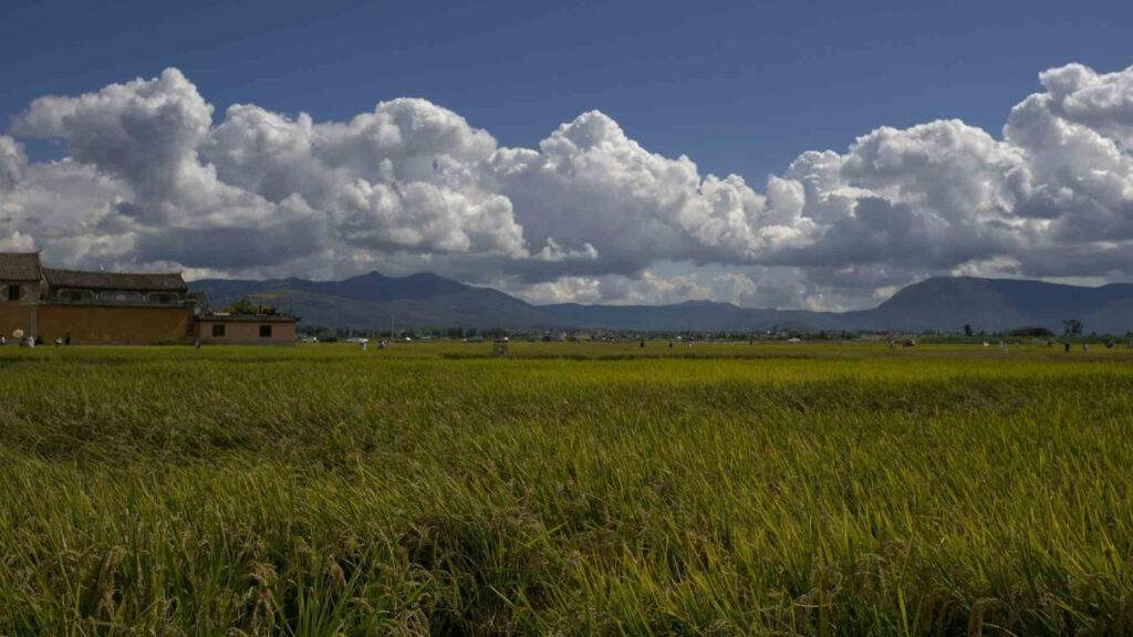 名物「喜洲破酥粑粑」(甘いものと塩味)は焼き立てが絶品。町の外れには広大な田園風景が広がります。